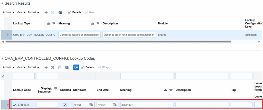 Create and enable a new lookup code ZX_37654331 for the existing ORA_ERP_CONTROLLED_CONFIG lookup type using the Manage Standard Lookups FSM task.