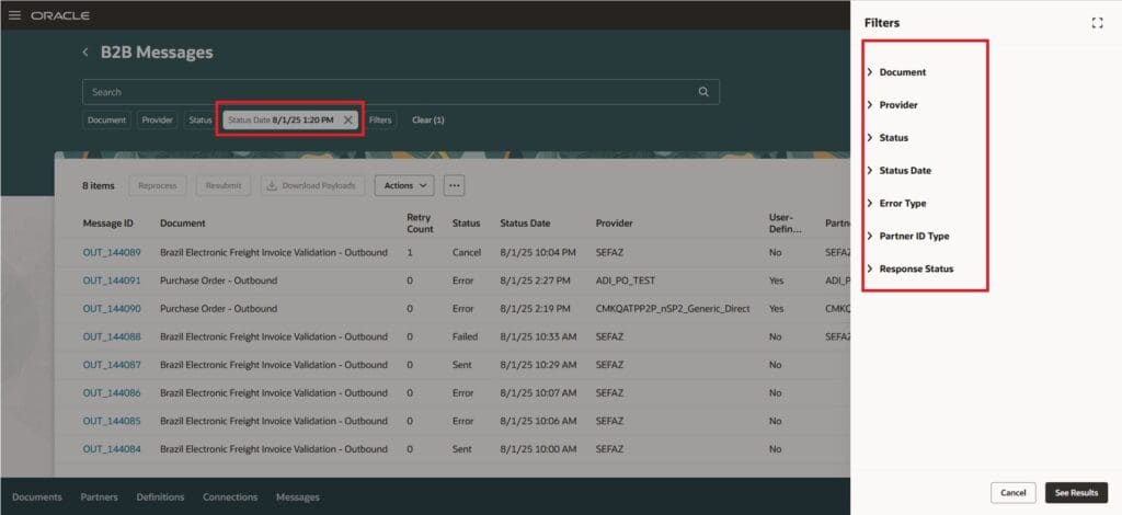 - All B2B messages from the last 24 hours are displayed by default. You can filter the messages by: