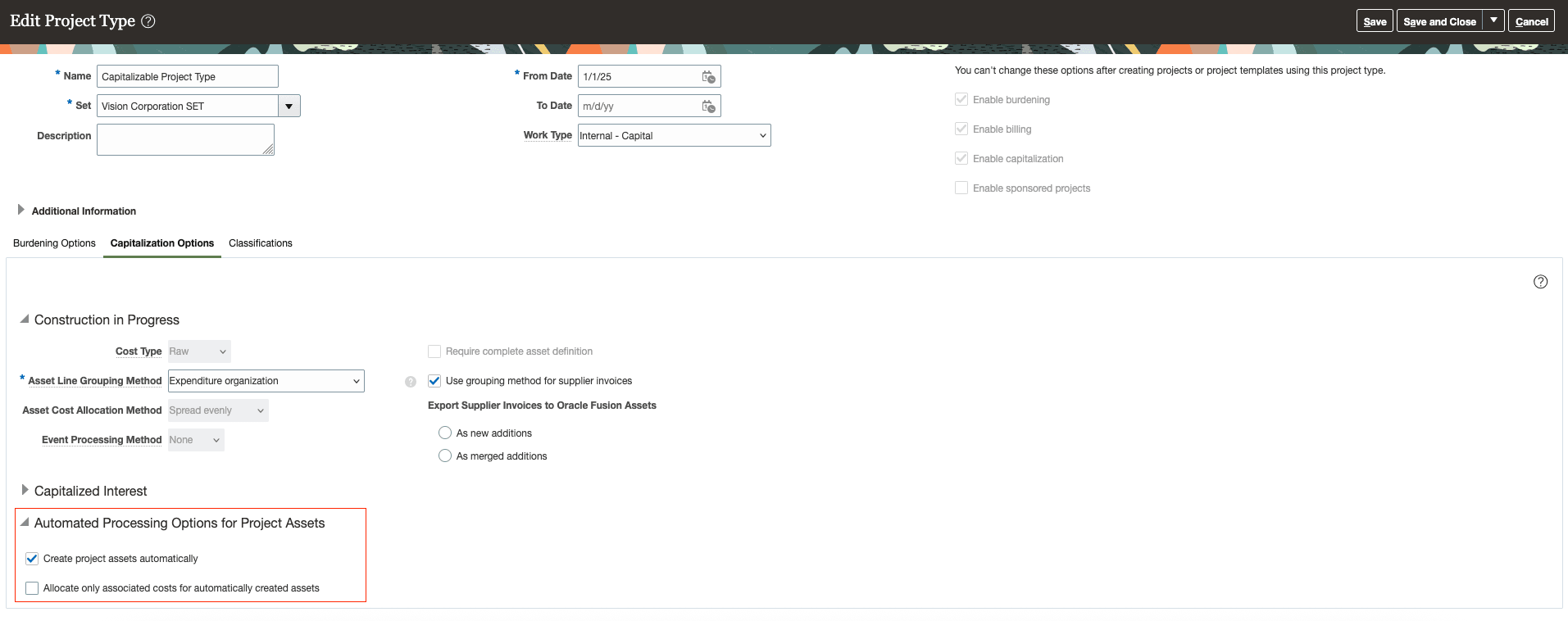 - Under the Capitalization Options section, enable or disable the Create Project Assets Automatically option in the Automated Processing Options for Project Assets subsection.