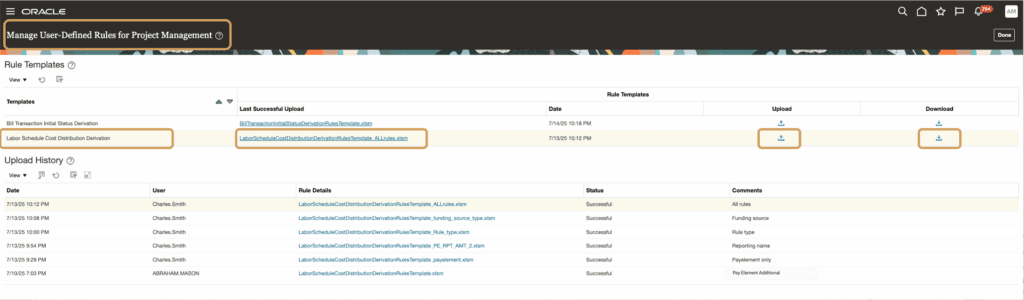 Leveraging the Manage User-Defined Rules for Project Management setup functionality, rule templates can be managed with history tracking and the ability to get the latest list of rules from the last successful upload and the base template from the download action, if needed.