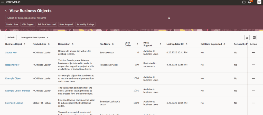 Users can search for and review the various business objects supported by HCM Data Loader and HCM Spreadsheet Data Loader. The page offers multiple functionalities, including viewing and updating business objects by Product Area, viewing roles that have bulk-loading access to a business object, and reviewing objects’ parameters and post processes.