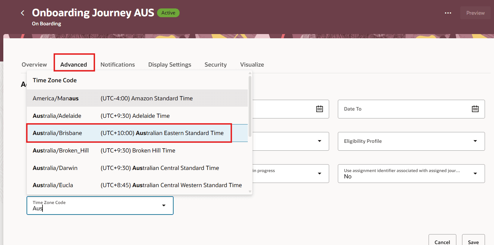 Preferred time zones can now be configured at the Journey template level using the new Time Zone Code field. This allows journey allocation, status changes, and time-based evaluations to follow the selected local time zone rather than the default UTC time zone. Due dates, expiry dates, delay duration, and reminder notifications are similarly updated to fit the selected time zone. To ensure that the code is applied correctly, confirm the Process HR Checklist and Tasks ESS process is scheduled to run daily.