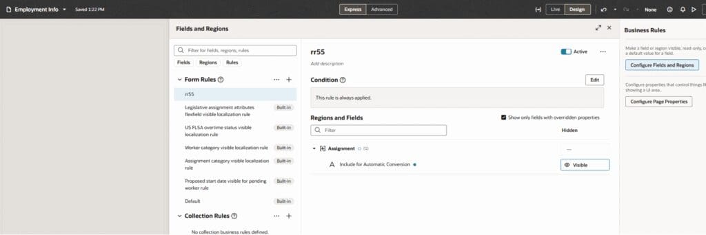 The Redwood Employment Info and View Employment Details pages can now display the Include for Automatic Conversion field by toggling it using Business Rules. This allows HR specialists to quickly verify a pending worker’s conversion readiness without navigating to other pages within the application.