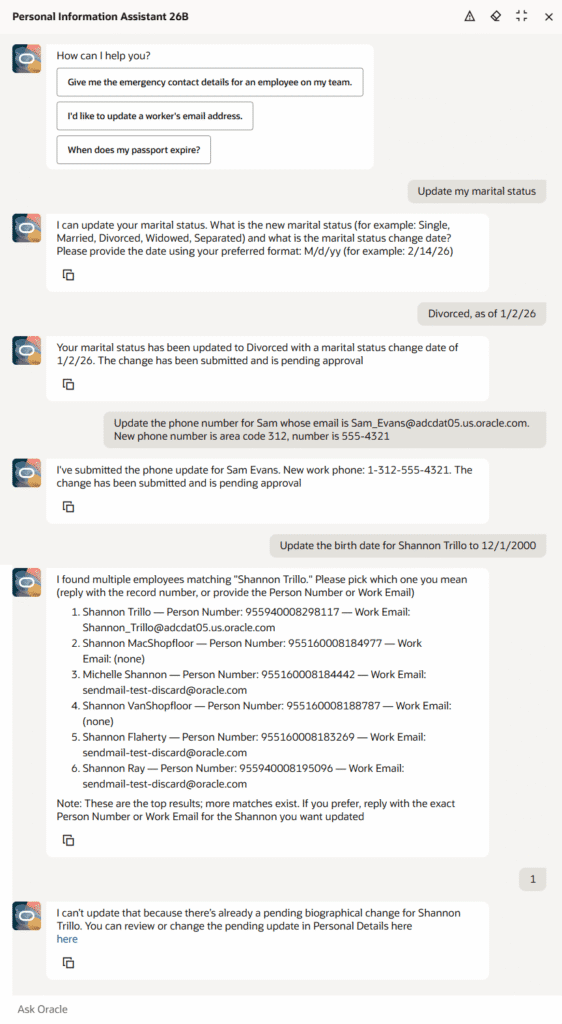 Oracle continues to rollout AI features in the 26B release, focusing on expanding the range of pages that support AI assistance and enhancing the capabilities of AI agents. The Document Records Management Assistant receives a V2 upgrade to better support line managers and HR specialists, while the Personal Information Assistant receives enhanced functionality that allows it to create, update, and delete selected personal information directly in the chat. Additionally, workflow agents can now be associated with Journeys tasks and trigger when those tasks are saved or completed.