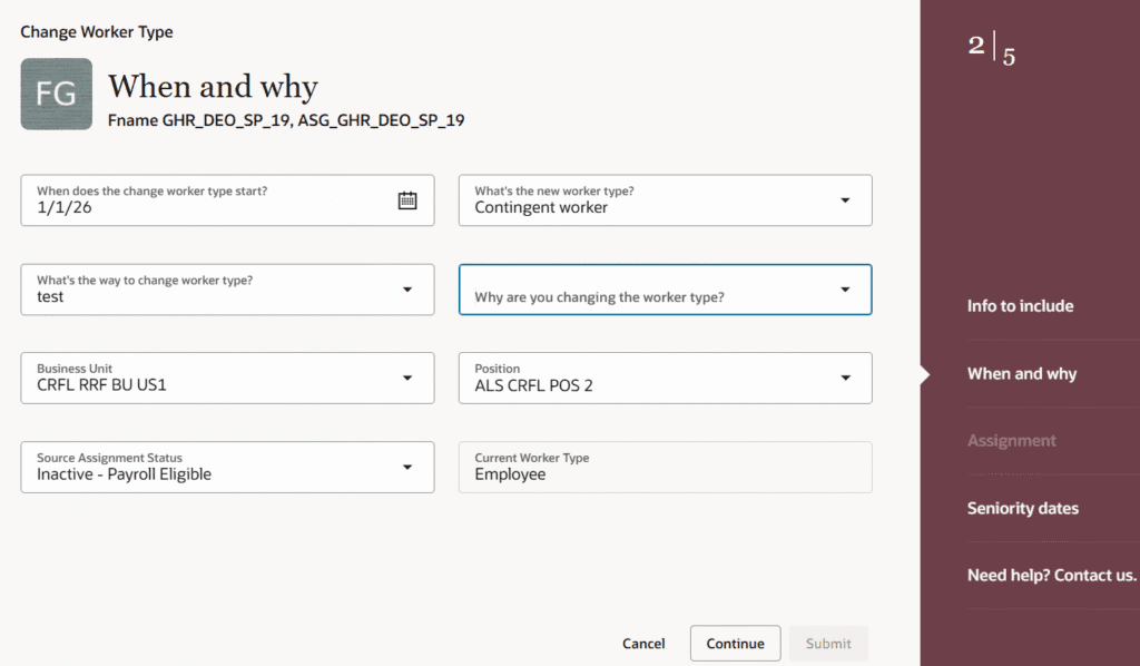 This enhancement allows businesses to more quickly respond to their changing needs and requirements by streamlining the process of changing a worker type, which previously required multiple steps and manual intervention when dealing with payroll.