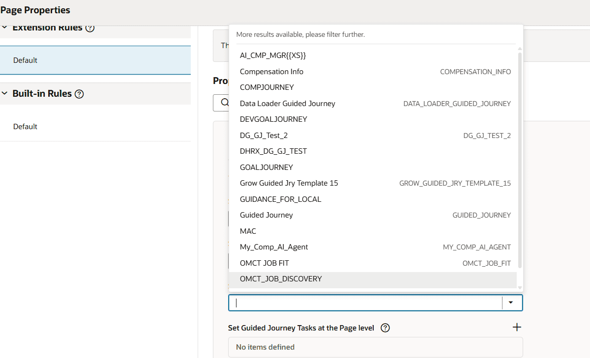 You can now define which page properties are conditionally applied to the logged-in user based on that user’s security access for all employment processes using the Configure Page Properties feature. This enhancement builds on previous updates to similar conditional page property configuration. Guided Journey codes and the Info to Include page properties will additionally be displayed as a list of values (LOV).