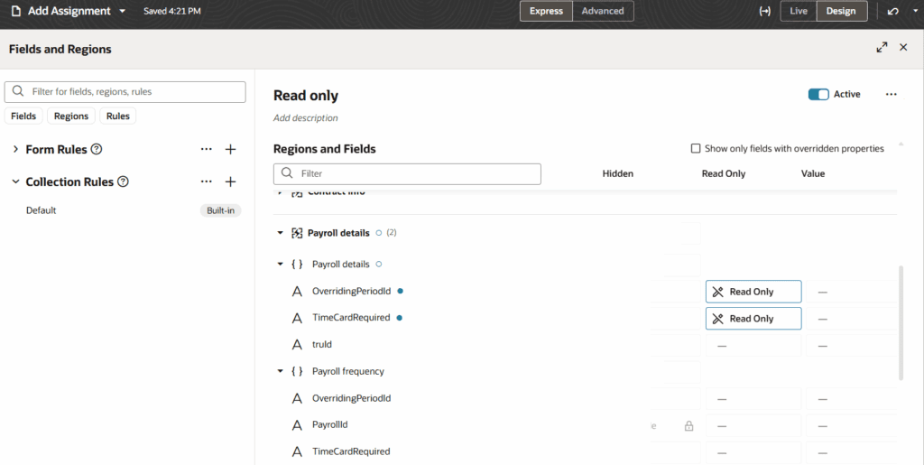 Businesses can now mark payroll fields as read-only for certain employment processes, including Add Assignment, Change Assignment, Promote, and Transfer. These fields can be toggled using the Visual Builder Studio (VBS) and selecting Configure Fields and Regions under Business Rules for the process.