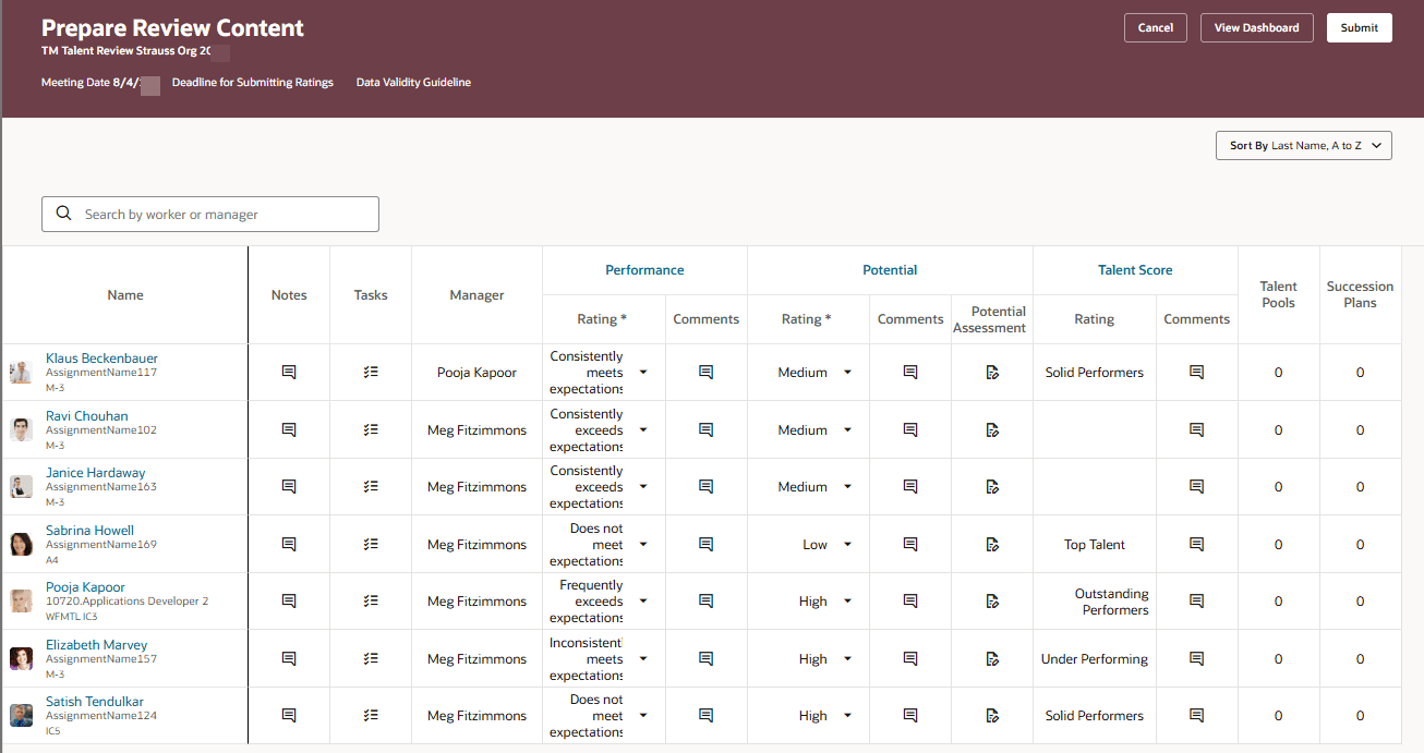 - Table view of the Talent Review dashboard