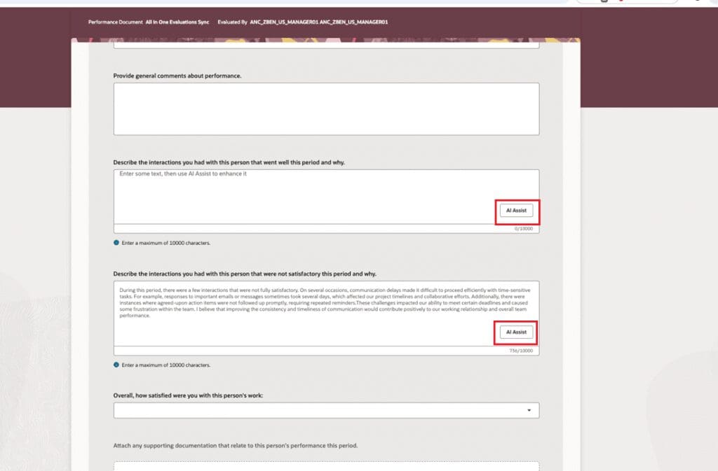 Oracle has introduced enhanced Generative AI capabilities in performance documents for workers, managers, and participants, with the same functionality available in All-in-One Evaluations. Users can leverage AI Assist to generate responses for text-based evaluation questions and to create evaluation comments in topic summaries for competencies, skills, and performance or development goals. These enhancements help users produce stronger initial responses and more comprehensive feedback by using Generative AI.