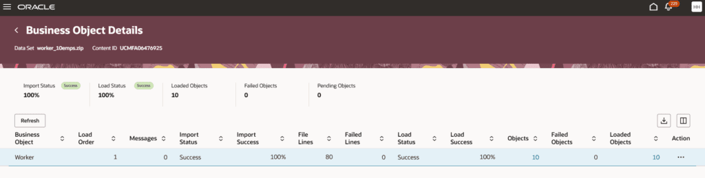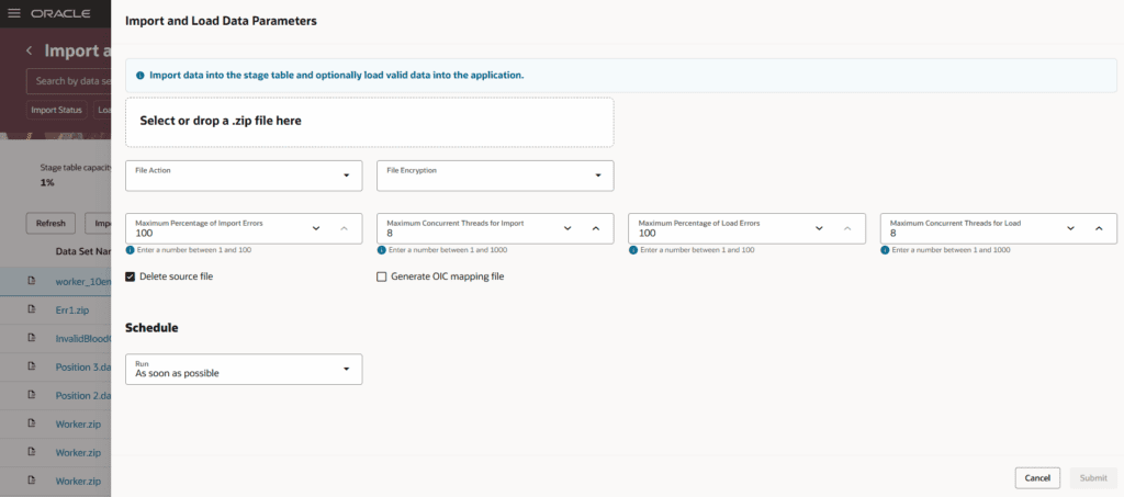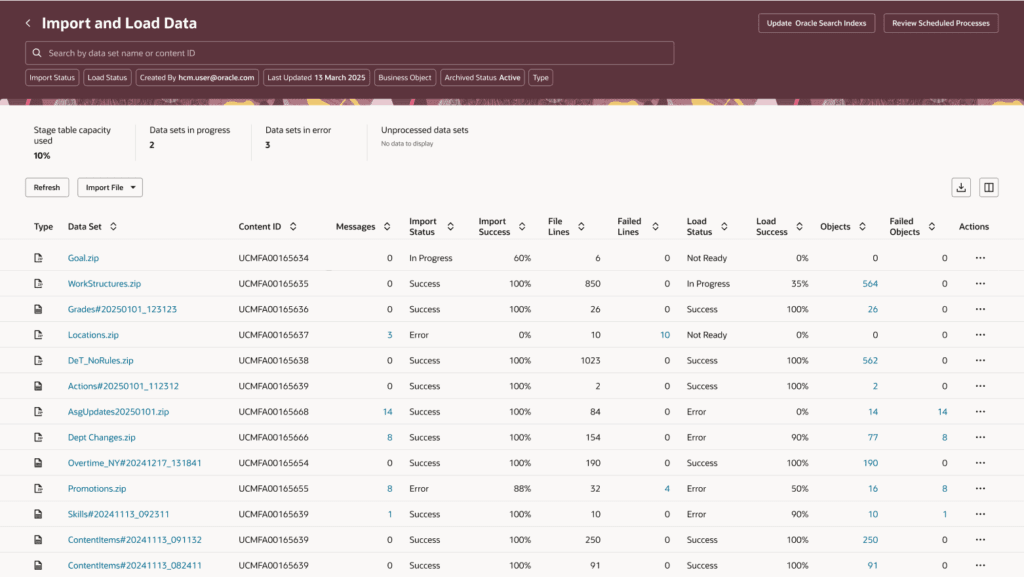 The Import and Load Data page is now available in Redwood, built using Visual Builder Studio (VBS). Using this application, users can import and load local files, schedule file imports from Oracle WebCenter, monitor file load progress, and review errors. Encompassed pages, such as Import and Load Data Parameters, Business Object Details, and Failed Object Messages are also updated to the Redwood UI.