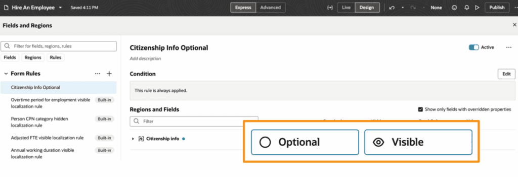 Optional regions can now be displayed automatically for Redwood Compact Guided Process (CGP) template pages, including processes such as Hire an Employee or Add Assignment. Regions marked as both “Optional” and “Visible” in Configure Fields and Regions (Express Mode in VB Studio) when “Info to Include” is hidden will now appear automatically. This enhancement reduces manual effort for end-users by streamlining and simplifying the workflow.