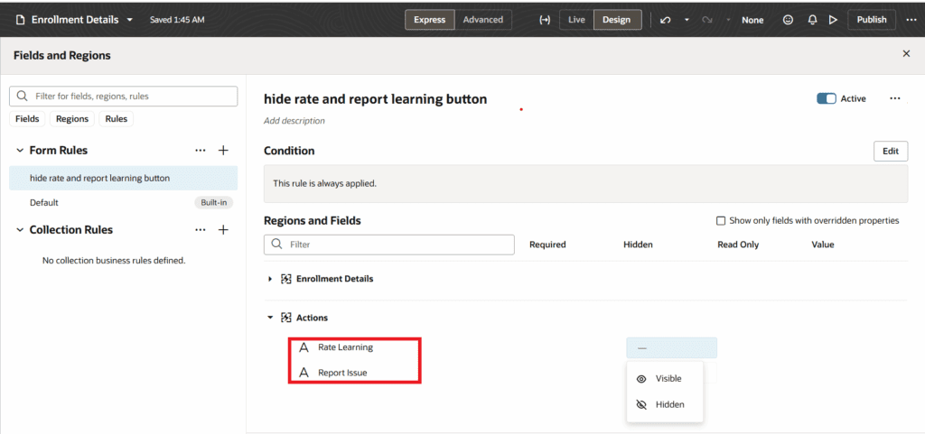 With the hide rate and report action enhancement you can now use business rules in Visual Builder Studio to hide the Rate and Report actions, helping you create a cleaner, more focused learning experience. With this enhancement, you can hide the Rate Learning button on Community Details, Topic Details, and Enrollment Details pages, and control the Report Issue option on Community Details, Catalog Details, Offering Details, Topic Details, and Enrollment Details pages. By tailoring these actions with business rules, you can streamline learning pages and present learners with only the most relevant options.