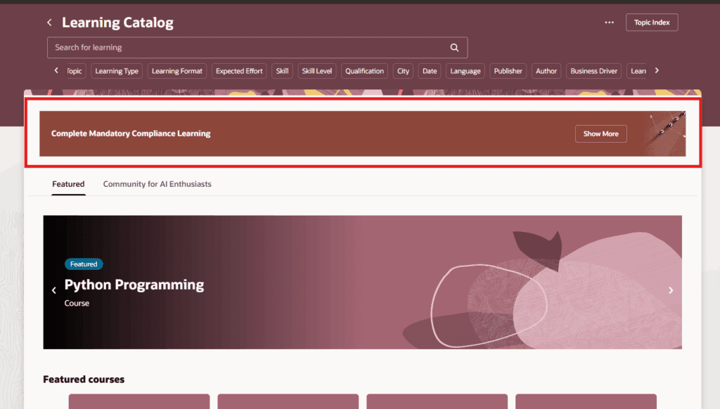 In Oracle HCM Learning Cloud 25D, Redwood delivers a streamlined experience for both learners and administrators. Self-paced learning management is now simplified with a single workflow, embedded content playback, completion affirmation, multi-language support, and improved search features. There are enhancements as to what you can customize in visual builder studio. The learning catalog now offers a unified browse-and-search page with hover details like badges, skills, and trailer videos, while administrators gain better catalog management tools. This release is a step in Redwood’s rollout to catalog management, with future releases set to include ILT and other areas.