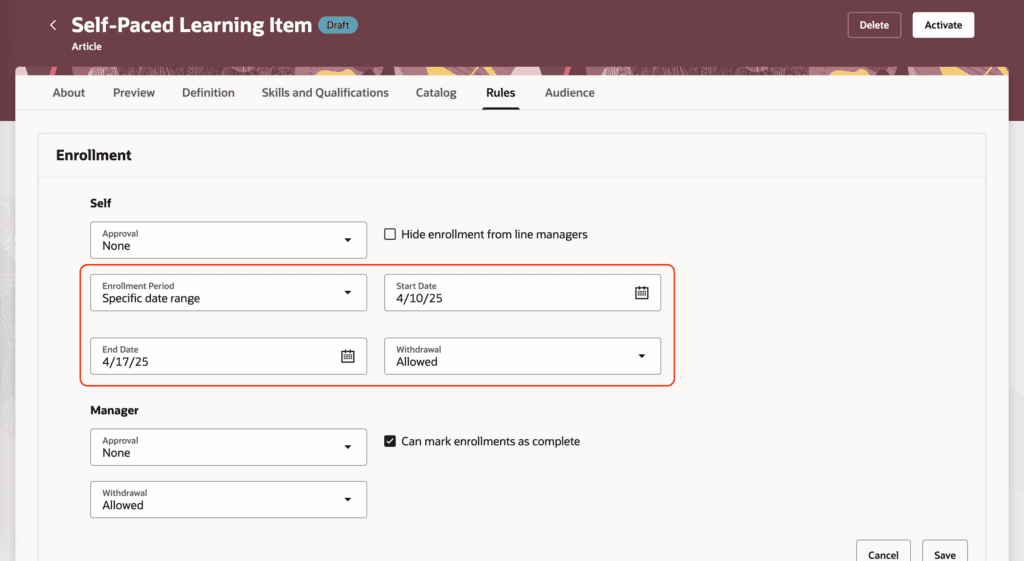 With the self-paced learning enrollment period enhancement you can set the self-enrollment period to a specific date range, define exact start and end dates, and enrollment will only be available during that window. When an enrollment period is configured to fall outside the catalog visibility period, only learners with a direct enrollment link—accessible via the About tab using the Copy Self-Enrollment Link action—can enroll. Learners or managers viewing a self-paced learning item outside its enrollment period won’t see an Enroll action on the learning item card or catalog details page; instead, they’ll see a banner message indicating either that enrollment will open on a specific date or that the enrollment period has ended. This enhancement gives you greater flexibility to control enrollment windows for self-paced learning, whether you want to restrict enrollment to a smaller timeframe or allow select learners to enroll outside of catalog visibility periods.