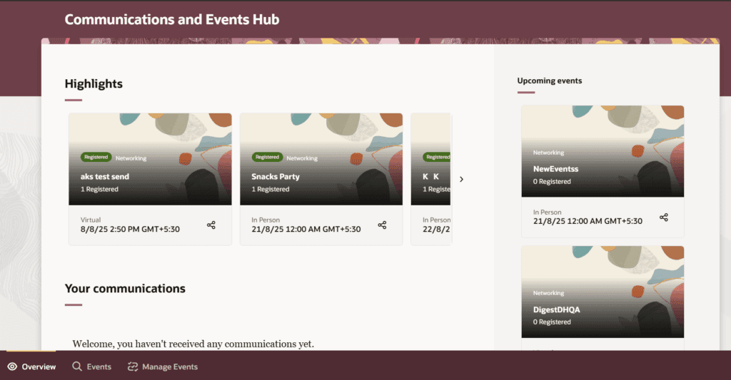 Oracle has released the Redwood experience for employee events. Employees now have access to the Communications and Events Hub to view and register for available events they may be interested in. Included are Redwood pages/panels for event creation, too.