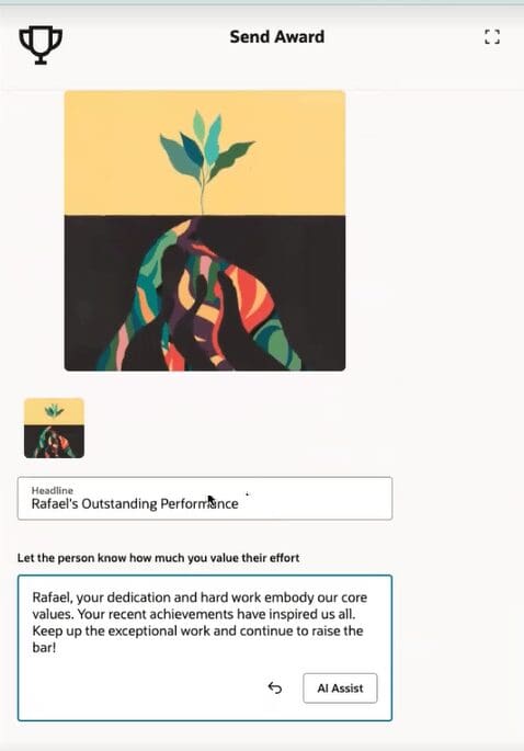This cycle’s enhancements involving Gen-AI revolve around assistance with presenting awards. When creating recognition messages while creating spot awards or service anniversaries, generative AI is available to help formulate content. The assistant suggests personalized, context-aware messages based on recipient details and other components.