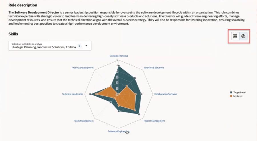 Users can now view how their skills compare to the target proficiencies for a specific career role in a Spider Chart. The visual enables employees to understand whatever gap may lie between their current skillset and what is desired for a potential role. Inversely, it will show employees where they might be well fit.