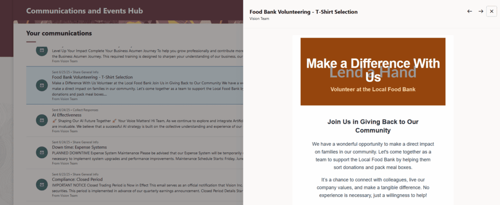 Employees can now view and interact with all their communications and events relevant to them within the Communications and Events Hub. The Hub is composed of multiple sections, giving them the ability to open and register for upcoming events, as well as search and view recent communications. This landing page will centralize employee communications.