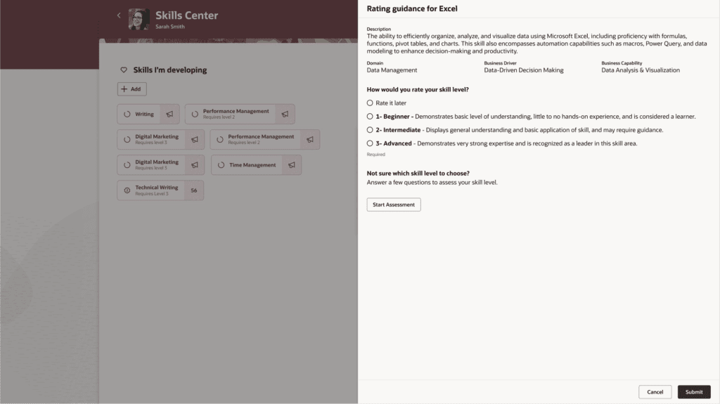 Oracle now allows you to control the visibility of the skills attributes on the rating guidance panel and skill details page. This enhancement helps provide additional context about the skill, assisting with appropriately rating it.